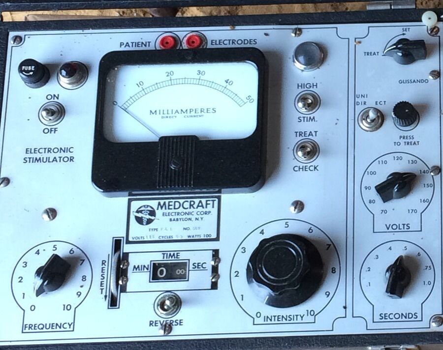 Some ECT advocates claim a new type of electricity used today, brief pulse, causes less harm than the older type, sine-wave (which is what comes out of a standard 120 volt a.c. household electric outlet). In contrast, one prominent ECT supporter, psychiatry professor Richard D. Weiner, M.D., Ph.D., cites studies that "demonstrated sine wave and bidirectional pulse stimuli produced equivalent amnestic changes" (Behavioral & Brain Sciences, March 1984, p. 18). According to Chicago Medical School psychiatry professor Richard Abrams, M.D., in his textbook Electroconvulsive Therapy, 400 volts is a typical peak voltage produced by the newer brief-pulse ECT devices (Oxford U. Press 1988, p. 113). This is more than double the highest voltages produced by the older sine-wave machines. The below photograph of an older MedCraft electroshock machine shows a maximum voltage (far right knob) of 170 volts rather than 400 or 450, and a maximum shock duration (lower right knob) of 1.0 second rather than up to 8 seconds delivered by newer ECT devices. The voltage being more than twice as high, and the shock duration being many times longer, suggest today's electroshock or ECT devices do more harm.